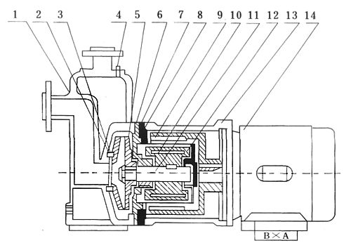 產品介紹 概述: ZCQ40-32-132耐腐蝕化工自吸磁力泵(以下簡稱自吸泵)是根據(jù)眾用戶的要求,在CQ型磁力泵的基礎上吸取國外技術,并經過工程技術人員反復研究試驗而成功的新產品。 該ZCQ40-32-132耐腐蝕化工自吸磁力泵以靜密封取代動密封,使泵的過流部件處于完全密封狀態(tài),徹底解決了其它泵機械密封無法避免的跑、冒、滴、漏之弊病,泵體及過流部件的材料均采用了耐腐蝕的不銹鋼、鋼玉陶瓷、四氟石墨等材料制造,既有CQ型磁力驅動泵的功能,又集自吸于一身,不需底閥和引灌水,自吸高度4米。 ZCQ40-32-132耐腐蝕化工自吸磁力泵結構緊湊,外形美觀,體積小,噪音低,運行可靠,使用維修方便,可廣泛用于石油、化工、制藥、電鍍、印染、食品、科研等單位抽送酸、堿、油類及稀有貴重液、毒液、揮發(fā)性液體,以及循環(huán)水設備配套,特別是易漏、易燃、易爆液體的抽送。 因此,它是有廣泛的用途,我們真誠地向用戶推薦這種新產品。 型號意義: ![]() 結構圖: ![]()