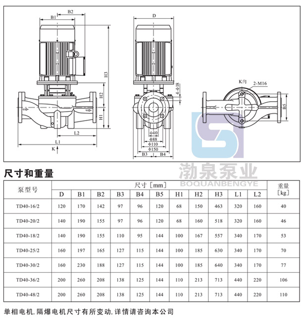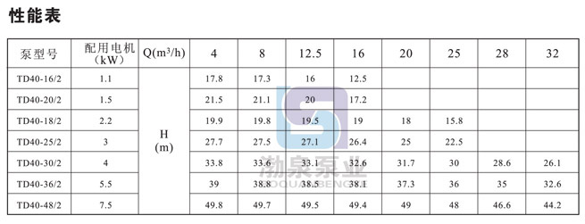 產(chǎn)品介紹 TD40-20/2 立式熱水管道泵配有標(biāo)準(zhǔn)電機(jī)和機(jī)械密封。此類產(chǎn)品的結(jié)構(gòu)與相近類型產(chǎn)品相比,更不易受到泵送液體中雜質(zhì)的影響。 產(chǎn)品設(shè)計(jì)為頂部可拉出的拆裝形式,其可以在不影響管路系統(tǒng)的情況下對泵進(jìn)行維護(hù)。 應(yīng)用 產(chǎn)品適宜在清潔、稀薄、非侵蝕、非易爆易燃,且不含有任何可能對泵造成機(jī)械或化學(xué)損害的固體顆粒和纖維的液體中使用。具體對液體要求及應(yīng)用如下;而在液體粘稠或密度較大情況下使用時(shí)會(huì)造成泵特性曲線的下降和能耗的增加。 液體溫度:-15℃~110℃ 系統(tǒng)最高壓力:常規(guī)型為PN12巴;特殊型為PN16巴。 TD40-20/2 立式熱水管道泵產(chǎn)品在用于輸送水時(shí),其可以用于生活用水、工業(yè)用水、冷卻系統(tǒng)用水和區(qū)域供熱系統(tǒng)的冷、熱用水。TD管道泵產(chǎn)品可以在以下位置使用: ·混合環(huán)路中的泵 ·鍋爐混流泵 ·燃?xì)饫鋬鰴C(jī)泵 ·部分流量過濾器泵 ·定壓系統(tǒng)用泵 ·生活熱水循環(huán) TD40-20/2 立式熱水管道泵產(chǎn)品用于工業(yè)方面。如在化工、制藥、食品加工等行業(yè)。可以用于: ·原料的輸送 ·系統(tǒng)增壓 ·混合環(huán)路循環(huán)泵 ![]() ![]() ![]() 安裝條件 TD40-20/2 立式熱水管道泵有不同的安裝要求,具體的安裝要求如下: ·系統(tǒng)管路具有支撐泵的能力,2.2kw以下(包括2.2kw)電機(jī)的泵可以直接懸置于管道中 ;系統(tǒng)管路不具有支撐泵的能力或泵電機(jī)功率大于2.2kw時(shí),泵必須安裝在支架或底板上。 ·對于配套2.2kw以下(包括2.2kw)電機(jī)的泵可以安裝在水平或垂直于管道的位置上;對于2.2kw以上電機(jī)的泵只能安裝在垂直于管道的位置上。 ·泵的安裝,要保證泵在使用時(shí)系統(tǒng)管路的張力不應(yīng)傳遞到泵體上。 ·為了保證電機(jī)的正常運(yùn)轉(zhuǎn),泵要安裝在保證有足夠冷卻的環(huán)境條件下,且冷卻空氣的溫度不能超過40℃。 ·如果泵安裝在戶外,必須配置合適的外罩以防止電器元件進(jìn)水或凝霜。 ·為了方便對泵的檢查和維修,在泵的上、下方必須留有足夠的空間。泵電機(jī)小于5.5kw時(shí)最小留300mm;泵電機(jī)大于5.5kw(包括5.5kw)時(shí)最小留1000mm。 ·為了防止噪音和振動(dòng),保證獲得最佳運(yùn)行效果,泵在安裝時(shí)要采用減振底座。一般采用水泥底座,底座的重量應(yīng)該是大于或等于1.5×泵重量。 ·為滿足客戶的不同需要,產(chǎn)品分為帶底板和不帶底板兩種。 因產(chǎn)品生產(chǎn)批次、型號不同,產(chǎn)品圖片及安裝尺寸僅供參考,詳情可聯(lián)系我們的銷售人員了解更多TD40-20/2 立式熱水管道泵相關(guān)信息!