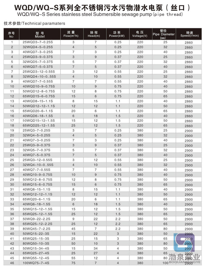 產(chǎn)品介紹 產(chǎn)品概述: 1、25WQ3-12-0.55S 耐酸堿不銹鋼化工污水泵采用獨特的單、雙流道式葉輪結(jié)構(gòu),大大提高了污物的通過能力,根據(jù)產(chǎn)品型號能通 過 泵口徑 5倍的纖維與直徑約為泵出口口徑50%的固體顆粒。 2、采用氟橡膠雙端面機封,氟橡膠徑向O型圈密封,有效地對環(huán)境惡劣的液體進行密封保護作用。 3、采用精密鑄造泵殼,重量輕、耐腐蝕、節(jié)能型、外形美觀、檢修方便,無需建泵房,潛入水中即可工作,減少工程造價。 4、排污泵內(nèi)安裝過熱與電流保護器,防止電機過載發(fā)熱。 5、可根據(jù)客戶特殊要求定制防腐蝕電纜線、四氟機封,及高溫液體的零件配置。 使用條件: 1、以葉輪中心為準,潛入水下深度不得超過5m。 2、輸送介質(zhì)溫度不高于60℃。 3、輸送介質(zhì)的PH值304(4-10),316(2-13). 產(chǎn)品用途: 不銹鋼排污泵適用于建筑樓宇、醫(yī)院、住宅小區(qū)、市政工程、道路交通及施工、工廠排污、養(yǎng)殖、藥業(yè)、飲料、海水鹽水、一般腐蝕性介質(zhì)中含有的固體顆粒、長纖維廢水、污水。 產(chǎn)品優(yōu)勢: 25WQ3-12-0.55S 耐酸堿不銹鋼化工污水泵采用獨特的單雙流道式葉輪結(jié)構(gòu),氟橡膠雙端面機封、氟橡膠O型圈密封,不銹鋼焊接轉(zhuǎn)子軸,以及不銹鋼精密鑄造外殼。其中,國標法蘭系列采用雙端面、單端面雙套機封密封。該產(chǎn)品能有效地在惡劣的液體環(huán)境下工作,具有耐腐蝕、耐高溫等特點。特別適用于化糞池、化工液體、海水排澇等場合。 ![]() 因產(chǎn)品生產(chǎn)批次、型號不同,產(chǎn)品圖片及安裝尺寸僅供參考,詳情可聯(lián)系我們的銷售人員了解更多25WQ3-12-0.55S 耐酸堿不銹鋼化工污水泵相關(guān)信息!