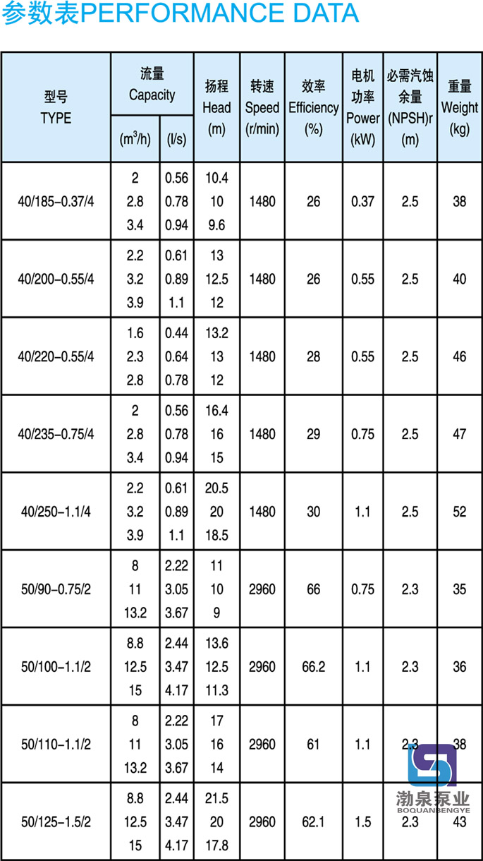產(chǎn)品介紹 KQL50/100-1.1/2 立式管道循環(huán)泵供輸送不含固體顆粒的清水及物理化學(xué)性質(zhì)類似于水的液體之用。同時根據(jù)使用溫度、介質(zhì)等不同在ISG型管道離心泵基礎(chǔ)上派出適用熱水、高溫、腐蝕性化工泵、油泵。該產(chǎn)品具有同效節(jié)能、噪音低、性能穩(wěn)定等特點。 用途: KQL50/100-1.1/2 立式管道循環(huán)泵用于空調(diào)、采暖、衛(wèi)生用水、水處理冷卻冷凍系統(tǒng)、液體循環(huán)和供水、增壓及灌溉等領(lǐng)域中無腐蝕的冷水和熱水輸送。 工作條件: 轉(zhuǎn)速:2960r/min,1480r/min或980r/min 流量范圍:1.8~2000m3/h 揚程:≤127m 介質(zhì)溫度:-10℃~120℃ 環(huán)境溫度:最大+40℃;海拔高度小于1000m;相對濕度不超過95% 材質(zhì): 泵殼、泵蓋、葉輪:鑄鐵 泵軸:45#鋼鍍鉻或不銹鋼(2Cr13) 機械密封動、靜環(huán):浸銻石墨、碳化硅 結(jié)構(gòu):結(jié)構(gòu)緊湊的單級泵,適用于現(xiàn)代建筑物的。 產(chǎn)品特點: KQL50/100-1.1/2 立式管道循環(huán)泵結(jié)構(gòu)緊湊、合理,泵與電機直接連接,外形美觀,占地面積小效率高,閉式鑄鐵葉輪,葉輪懸臂短,機泵軸完全同心,泵運行平穩(wěn)、可靠,噪音低壽命長,強制環(huán)流沖洗機械密封,免保養(yǎng)、無滲漏。 管道泵選型指南: 例如:KQL80/160-7.5/2 或KQW80/160-7.5 KQL標(biāo)準(zhǔn)立式單級離心泵,KQW標(biāo)準(zhǔn)臥式單級離心泵 80進(jìn)出口直徑 160葉輪名義直徑 7.5/2電機功率/電機極數(shù) ![]() ![]() 因產(chǎn)品生產(chǎn)批次、型號不同,產(chǎn)品圖片及安裝尺寸僅供參考,詳情可聯(lián)系我們的銷售人員了解更多KQL50/100-1.1/2 立式管道循環(huán)泵相關(guān)信息!