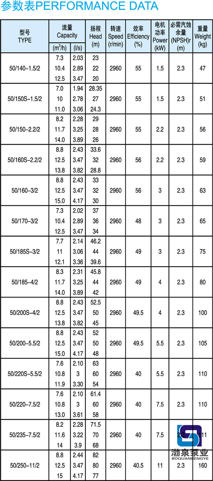 產(chǎn)品介紹 KQL50/185-4/2 立式單級單吸離心泵供輸送不含固體顆粒的清水及物理化學(xué)性質(zhì)類似于水的液體之用。同時(shí)根據(jù)使用溫度、介質(zhì)等不同在ISG型管道離心泵基礎(chǔ)上派出適用熱水、高溫、腐蝕性化工泵、油泵。該產(chǎn)品具有同效節(jié)能、噪音低、性能穩(wěn)定等特點(diǎn)。 用途: KQL50/185-4/2 立式單級單吸離心泵用于空調(diào)、采暖、衛(wèi)生用水、水處理冷卻冷凍系統(tǒng)、液體循環(huán)和供水、增壓及灌溉等領(lǐng)域中無腐蝕的冷水和熱水輸送。 工作條件: 轉(zhuǎn)速:2960r/min,1480r/min或980r/min 流量范圍:1.8~2000m3/h 揚(yáng)程:≤127m 介質(zhì)溫度:-10℃~120℃ 環(huán)境溫度:最大+40℃;海拔高度小于1000m;相對濕度不超過95% 材質(zhì): 泵殼、泵蓋、葉輪:鑄鐵 泵軸:45#鋼鍍鉻或不銹鋼(2Cr13) 機(jī)械密封動(dòng)、靜環(huán):浸銻石墨、碳化硅 結(jié)構(gòu):結(jié)構(gòu)緊湊的單級泵,適用于現(xiàn)代建筑物的。 產(chǎn)品特點(diǎn): KQL50/185-4/2 立式單級單吸離心泵結(jié)構(gòu)緊湊、合理,泵與電機(jī)直接連接,外形美觀,占地面積小效率高,閉式鑄鐵葉輪,葉輪懸臂短,機(jī)泵軸完全同心,泵運(yùn)行平穩(wěn)、可靠,噪音低壽命長,強(qiáng)制環(huán)流沖洗機(jī)械密封,免保養(yǎng)、無滲漏。 管道泵選型指南: 例如:KQL80/160-7.5/2 或KQW80/160-7.5 KQL標(biāo)準(zhǔn)立式單級離心泵,KQW標(biāo)準(zhǔn)臥式單級離心泵 80進(jìn)出口直徑 160葉輪名義直徑 7.5/2電機(jī)功率/電機(jī)極數(shù) ![]() ![]() 因產(chǎn)品生產(chǎn)批次、型號不同,產(chǎn)品圖片及安裝尺寸僅供參考,詳情可聯(lián)系我們的銷售人員了解更多KQL50/185-4/2 立式單級單吸離心泵相關(guān)信息!
