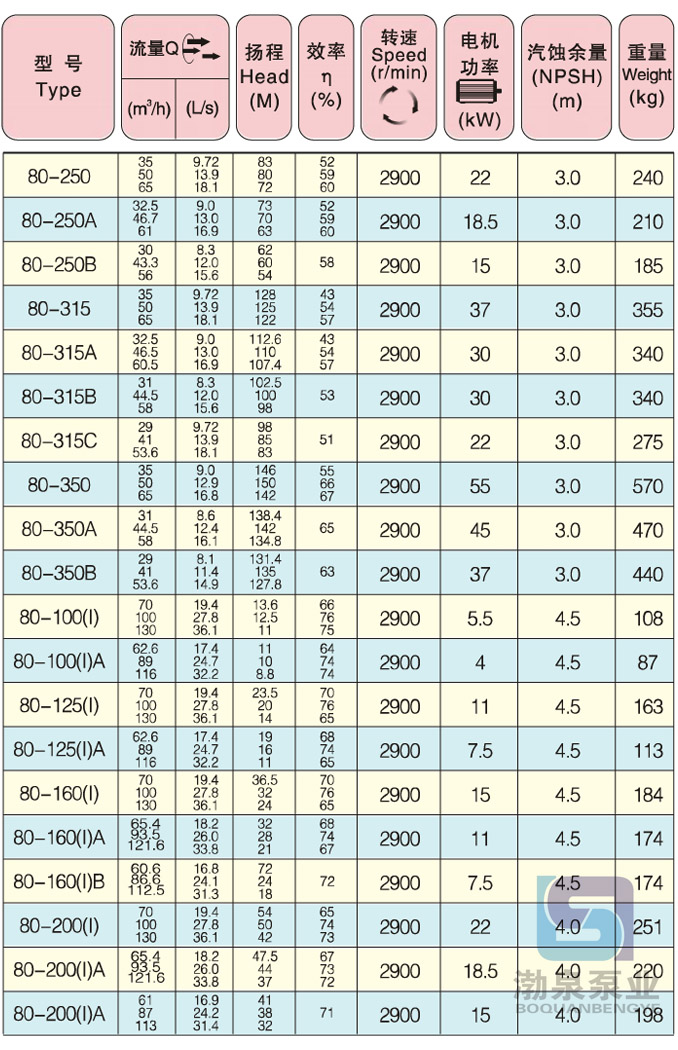 產品介紹 ISWR80-160(I)B 臥式管道離心泵是采用IS型離心泵之性能參數,在一般臥式泵的基礎上進行巧妙組合設計而成,同時根據使用溫度、介質等不同在ISW型管道泵基礎上派生出適用熱水泵、高溫、耐腐蝕化工泵、油泵。該系列產品具有高效節能、噪音低、性能可靠等優點,符合JB/T53058-93的標準要求,產品按ISO2858標準設計制造。具有效率高、流量及揚程范圍大、結構合理、成本低、壽命長、占地面積小、安裝維修方便等特點。是替代IS、DL等常規產品的新離心泵,特別適用于高層建筑的給排水、噴灌、冶金、市政、礦山水處理排污,食品、化工、空調及其他行業輸送水、化學介質及其他液體。 ISWR80-160(I)B 臥式管道離心泵流量范圍15~1200m3 /h,分基本型、擴流型、A、B、C切割型等250多種規格,并根據流體介質和溫度不同又派生出清水泵、熱水泵、化工泵、防爆油泵、防爆化工泵等系列產品。 ISWR80-160(I)B 臥式管道離心泵主要用途 1、ISW臥式清水泵供輸送清水及物理化學性質類似于清水的其它液體之用,適用于工業和城市給排水、高層建筑增壓送水、園林噴灌、消防增壓、遠距離輸送、暖通制冷循環、浴室等冷暖水循環增壓及設備配套,使用溫度T≤80℃。 2、ISWR臥式熱水泵,廣泛適用于:冶金、化工、紡織、造紙以及賓館飯店等鍋爐熱水增壓循環輸送及城市采暖系統,ISWR型使用溫度T≤120℃。 3、ISWH臥式化工泵,供輸送不含固體顆粒,具有腐蝕性。粘度類似于水的液體,適用于石油、化工、冶金、電力、造紙、食品、制藥和合成纖維等部門,使用溫度為-20℃~+120℃。 4、ISWY臥式管道油泵,供輸送汽油、煤油、柴油等油類產品或易燃、易爆液體,被輸送介質溫度為-20℃~120℃。 5、ISWHY型臥式不銹鋼防爆化工離心泵,適用于輸送易燃性化工液體。 6、ISWD臥式低轉速泵,適應要求環境噪聲很低的場合,使用溫度T≤120℃。 ISWR80-160(I)B 臥式管道離心泵工作條件 1.吸入壓力≤1.0MPa,或泵系統最高工作壓力≤1.6MPa,即吸入口壓力+泵揚程≤1.6MPa、泵靜壓試驗壓力為≤2.5MPa,訂貨時請注明系統工作壓力。泵系統工作壓力大于1.6MPa時應在訂貨時另行提出,以便在制造時泵的過流部分和聯接部分采用鑄鋼材料。 2.環境溫度<40℃,相對濕度<40%。 3.所輸送介質中固體顆粒體積含量不超過單位體積的0.1,粒度<0.2mm。 注:如果用介質為帶有細小顆粒,請在訂貨時說明,以便廠家采用耐磨式機械密封。 ISWR80-160(I)B 臥式管道離心泵產品特點 運行平穩:泵軸的絕對同心度及葉輪優異的動靜平衡,保證平穩運行,絕無振動。 滴水不漏:不同材質的硬質合金密封,保證了不同介質輸送均無泄漏。 噪音低:兩個低噪音軸承支撐下的水泵,運轉平穩,除電機微弱聲響,基本無噪音。 故障率低:結構簡單合理,關鍵部分采用品質配套,整機無故障工作時間大大提高。 維修方便:更換密封、軸承,簡易方便。 占地更?。撼隹诳上蜃?、向右、向上三個方向,便于管道布置安裝,節省空間。 ![]() ![]() ![]() 因產品生產批次、型號不同,產品圖片及安裝尺寸僅供參考,詳情可聯系我們的銷售人員了解更多ISWR80-160(I)B 臥式管道離心泵相關信息!