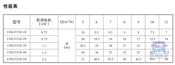 產品介紹 CHLF8-10LSWSC輕型臥式多級離心泵配加長軸電機采用了免修機械密封,緊湊式結構使泵尺寸很小,軸向入口和徑向出口。輕型段式多級離心泵的過流部件均采用不銹鋼材料(304或316)制成,輕型不銹鋼多級離心泵具有低噪音,耐輕腐蝕,外形美觀、體積小、重量輕、使用壽命長等特點,不同材質的硬質合金密封,保證了不同介質輸送均無泄漏;噪音低:兩個低噪音軸承下的水泵,運轉平穩,除電機微弱聲響,基本無噪聲;故障率低:結構簡單合理,整機無故障工作時間大大提高。采用國內優秀水力模型優化設計而成,是理想的新一代高效節能輕型臥式多級離心泵。采用了免修機械密封。輕型段式多級離心泵的過流部件均采用不銹鋼材料(304或316)制成,具有低噪音,耐輕腐蝕,外形美觀、體積小、重量輕、使用壽命長等特點。 二、應用范圍: 主要用于家庭型中央空調循環及工業上液體的傳輸。如脫礦物質水、軟水、凈化系統、輕油等的循環和增壓。 1)小型中央空調循環 2)冷卻系統 3)工業清洗 4)水處理(水的凈化) 5)水產養殖 6)施肥/計量系統 7)環境應用 三、工作條件: 稀薄、干凈、不凝、不爆炸、不含固體顆?;蚶w維的液體。 液體溫度: 常溫型-15℃至+70℃ 熱水型+70℃至+110℃ 最大環境溫度:+40℃ 最大運作壓力:10巴 最大進口壓力受最大運作壓力限制 介質酸堿性:PH4~9 四、輸送液體: 1、稀薄、清潔、不含固體顆?;蚶w維的非易燃易爆液體。 2、泵可以輸送諸如礦泉水、軟化水、純水、清油和其它輕化工介質。 3、當輸送液體的密度或粘度大于水,如需要,必須配用大功率電機。 4、泵是否適用于某一特定液體由多種因素決定,其中最重要的是氯含量、PH值、溫度和溶濟、油的含量等。 五、曲線條件: 下述條件適用于后面所示性能曲線。 1、所有曲線都基于電機在恒速2900rpm的測量值。 2、曲線容差符合ISO9906,附錄A。 3、測試采用20℃不含空氣的水,運動粘度為1mm2/s。 4、泵的使用參照加粗曲線的性能范圍,以防流量過小產生過熱和流量過大使電機過載等。 六、電機: CHLF8-40LSWSC輕油增壓泵電機為全封閉,風冷式二極電機 防護等級:IP55 絕緣等級:F 標準電壓, 50Hz: 1×220-240V 3×220-240V 380-415V ![]() 因產品生產批次、型號不同,產品圖片及安裝尺寸僅供參考,詳情可聯系我們的銷售人員了解更多CHLF8-10LSWSC輕型臥式多級離心泵相關信息!