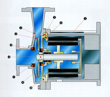 | | 1 | 泵 體 | 不銹鋼 | | 2 | 葉 輪 | 不銹鋼 | | 3 | 隔 板 | 不銹鋼 | 4 | 主 軸 | 不銹鋼 | | 5 | 轉(zhuǎn)子組合 | 稀土永磁體+不銹鋼 | | 6 | 隔套總成 | 不銹鋼 | | 7 | 動(dòng) 環(huán) | 填充F4 | | 8 | 軸 承 | 填充F4 | | 9 | 靜 環(huán) | 碳化硅或氧化鋁陶瓷 | | 10 | 密封圈 | 氟橡膠 | | 六、型號(hào)意義: