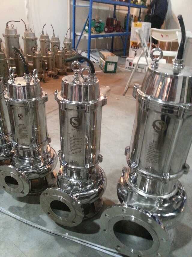 WQ不銹鋼潛水排污泵概述 1,國標法蘭WQ(D)-S全不銹鋼潛水排污泵采用不銹鋼精密鑄造外殼,具有耐腐蝕,環保型,揚程高,流量大等特點。 2,油室采用氟橡膠雙面機械密封,外室采用單面氟橡膠機械油封結構,有效地減少因骨架油封與軸之間摩擦而造成的密封進水問題。 3,電機采用高溫線,F級絕緣,熱保護裝置,有效地延長泵的使用壽命。 4,根據客戶要求,可帶攪勻裝置,該裝置隨電機軸旋轉產生極強的攪拌力,將污水池內的沉積物攪拌成懸浮物后排出。也可帶切割裝置,能將污水 中的長纖維,塑料,紙袋,稻草等雜物碎片后排出。 5,可根據客戶特殊要求定制防腐蝕電纜線,四氟機封,及高溫液體的零件配置。
