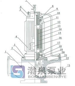 結(jié)構(gòu)見圖。該泵為機泵一體結(jié)構(gòu),整機主要由泵體、葉輪、聯(lián)接體、滑動軸承、定子、轉(zhuǎn)子、屏蔽套、電機殼等零部件組成。泵為立式單級單吸離心式,進出口在同一水平軸線上,口徑規(guī)格相同可直接象閥門一樣安裝在管路的任何部位上,裝卸極為方便,占地面積省。泵通過聯(lián)接體與電機或一體,軸承采用進口石墨浸漬樹脂復合軸承,電子定轉(zhuǎn)子各有屏蔽套進行隔離。軸承采用流體本身介質(zhì)作為潤滑劑及冷卻液,具有設(shè)計合理、運行可靠的特點。泵設(shè)有底座,可直接安裝在地基上,因該泵具有低噪音,無振動特點,安裝時無需加裝隔振器或隔振墊。