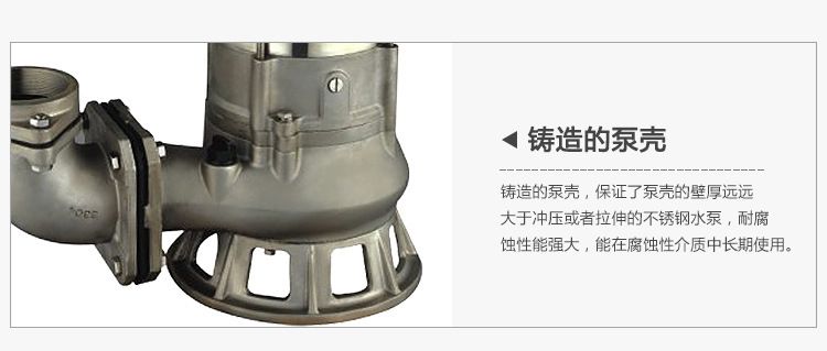 ![]() ![]() 不銹鋼潛水排污水泵產品簡介 不銹鋼污水泵是電機與水泵同軸一體潛入介質中工作的水利機械,具有無堵塞,防纏繞,結構緊密,體積小,耐磨、耐腐蝕,體積小等優點。該產品整體機殼采用不銹鋼材質,耐腐蝕性強、選材精良、結構先進、過流通道寬闊、排污能力強。適用于輸送含有酸堿成分的污水,例如樓房廢水、化工廠污水、食品廠、海水處理等等。 不銹鋼潛水排污水泵特點 1.整體外殼采用不銹鋼SUS304材質精密鑄造制成,專門抽取有微酸弱堿的污水。 2.日本進口NSK軸承,具有高回轉、低噪音、低振動、低磨損轉矩等特點,延長使用壽命。 3. 配備過載保護器,當電壓下降、葉輪堵塞、水位下降低于理想液位等情況引起的溫度過高時,會自動切斷電源,使水泵停止工作。 4. 不銹鋼開式葉輪和軸,耐磨耐用,因葉輪的特殊結構和力學位置設計,能把固體顆粒及長纖維以高速甩出泵腔而不卡住葉輪,抗堵塞性能佳。 5.采用耐腐蝕耐酸堿氟膠O型圈、密封件和耐腐蝕耐酸堿機械密封 6. 電機采用國標銅線電機 7. 耐腐蝕耐酸堿電纜線 不銹鋼潛水排污水泵使用條件 1.介質溫度不超過50℃,密度為1.0-1.3kg/m3,304的使用范圍在PH值4-10之間好用,如果超過該介質,建議使用316. 2.一般情況下,泵必須在使用揚程范圍內使用,保證電機不過載,如需在全揚程范圍內使用,應在訂貨時另行注明。 3.在運行過程中電機電流不得超過電機的額定電流。 4、使用時,水泵的電機1/2以上部分必須浸入水中。 不銹鋼潛水排污水泵選型 不銹鋼污水泵規格較多,能適用于不同用戶的不同工況,只有正確合理的選用符合工況的規格及方式,才能以較少的投入發揮效益,同時,合理的工況能有效地延長水泵壽命,方法如下: 1. 掌握現場情況是否與使用條件符合(電壓、頻率、水質、電源容量等)。 2. 選擇水泵規格 1)流量的初步選擇:根據需求確定水泵流量。 2)管路的確定:根據輸送介質計算臨界沉降流速,合理選擇管路直徑。 3)管路損失計算:根據管路長度和彎管、閥門數量計算管路損失。 4)水泵揚程計算:水泵揚程=水面至出水口垂直高差+管路損失+出口壓力+安全余量(10%)。 5)根據流量揚程確定水泵型號 6)確定安裝方式:固定式、移動式。 不銹鋼潛水排污水泵使用場合 1、工廠污水處理 2、污水處理廠 3、電鍍廢水處理 4、城市污水處理 5、抽取海水 ![]() ![]() ![]() ![]() ![]() ![]() ![]() ![]() ![]() ![]()