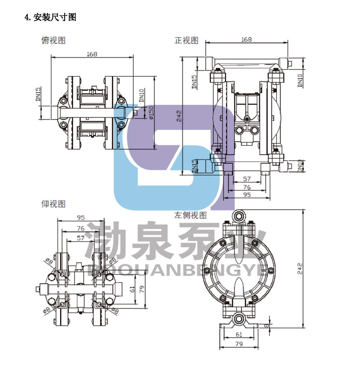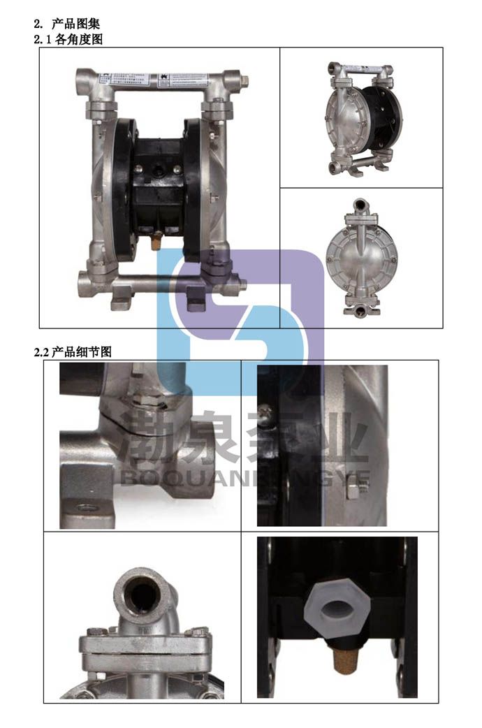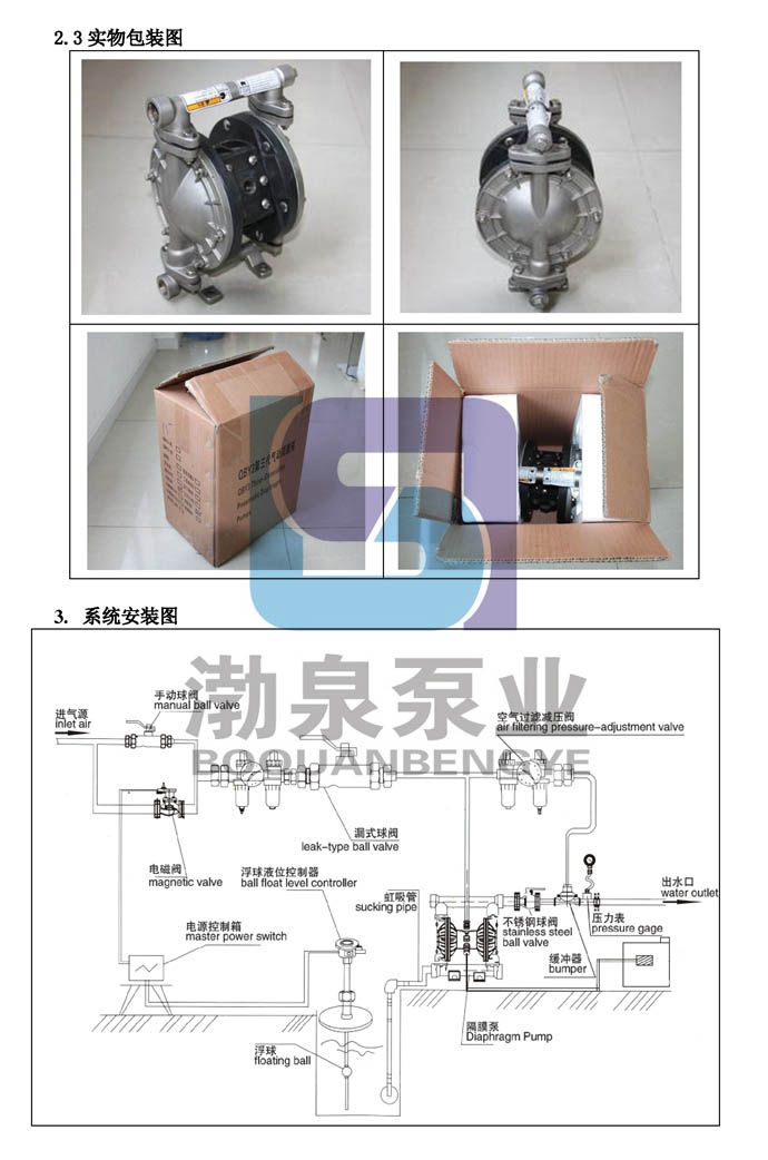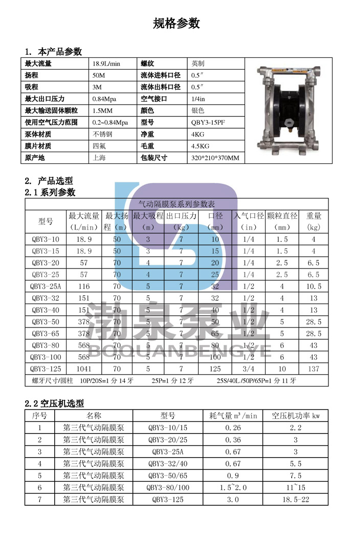 1.產(chǎn)品概述: QBY3系列第三代氣動隔膜泵,采用壓縮空氣為動力源,是一種由膜片往復(fù)變形造成容積變化的容積泵。不銹鋼氣動隔膜泵具有質(zhì)量可靠、使用壽命長、噪音底、震動小、永不死機(jī)、做工精細(xì)等六大優(yōu)點,既能抽送流動的液體,又能輸送一些不易流動的介質(zhì),具有自吸泵、潛水泵、屏蔽泵、泥漿泵和雜質(zhì)泵等輸送機(jī)械的許多優(yōu)點。 性能特點: 1.不需灌引水,吸程高達(dá)5米,揚(yáng)程達(dá)70米,出口壓力≧7bar; 2.流動寬敞,通過性能好,允許通過最大顆粒直徑達(dá)10毫米。抽送泥漿、雜質(zhì)時,對泵磨損甚微; 3.揚(yáng)程、流量可通過氣閥開度實現(xiàn)無級調(diào)節(jié)(氣壓調(diào)節(jié)在1-7bar之間); 4.該泵無旋轉(zhuǎn)部件,沒有軸封,隔膜等抽送的介質(zhì)與泵的運(yùn)動部件、工件介質(zhì)完全隔開,所輸送的介質(zhì)不會向外泄漏。所以抽送有毒、易揮發(fā)或腐蝕性介質(zhì)時,不會造成環(huán)境污染和危害人身安全; 5.不必用電,在易燃、易爆場所使用安全可靠; 6.可以浸沒在介質(zhì)中工作; 7.使用方便、工作可靠、開停只需簡單地打開和關(guān)閉氣體閥門,即使由于意外情況而長時間無介質(zhì)運(yùn)行或突然停機(jī)泵也不會因此而損壞,一旦超負(fù)荷,泵會自動地停機(jī),具有自我保護(hù)性能,當(dāng)負(fù)荷恢復(fù)正常后,又能自動啟動運(yùn)行; 8.結(jié)構(gòu)簡單、易損件少,該泵結(jié)構(gòu)簡單,安裝、維修方便,泵輸送的介質(zhì)不會接觸到配氣閥,聯(lián)桿等運(yùn)動部件,不像其他類型的泵因轉(zhuǎn)子、活塞、齒輪、葉片等部件的磨損而使性能逐步下降; 9.可輸送較粘的液體(粘度在1萬厘泊以下); 10.本泵無須用油潤滑,即使空轉(zhuǎn),對泵也無任何影響,這是該泵一大特點; 11.塑料法蘭壓力:PN0.6MPa(10bar),金屬法蘭壓力:PN1.0MPa(10bar)。 ![]() ![]() ![]() ![]() ![]()
